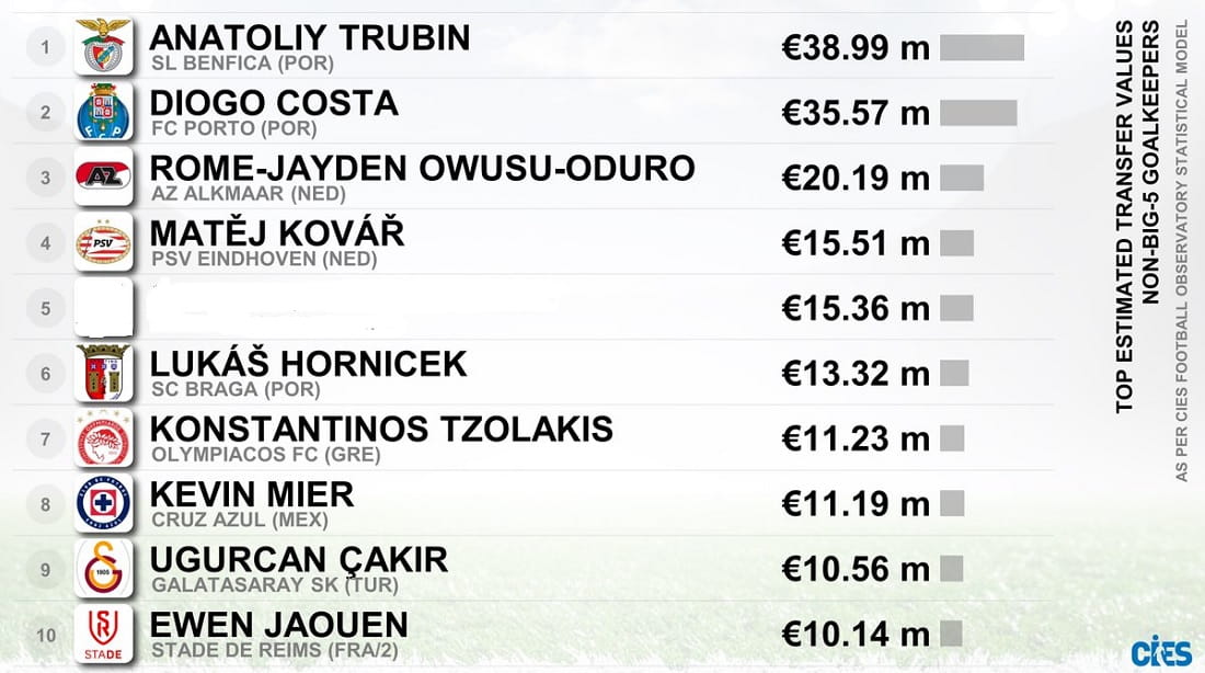 Дуже приємно, що цей реєстр очолив голкіпер Бенфіки та збірної України Анатолій Трубін, якого CIES оцінив у 38,99 млн євро.