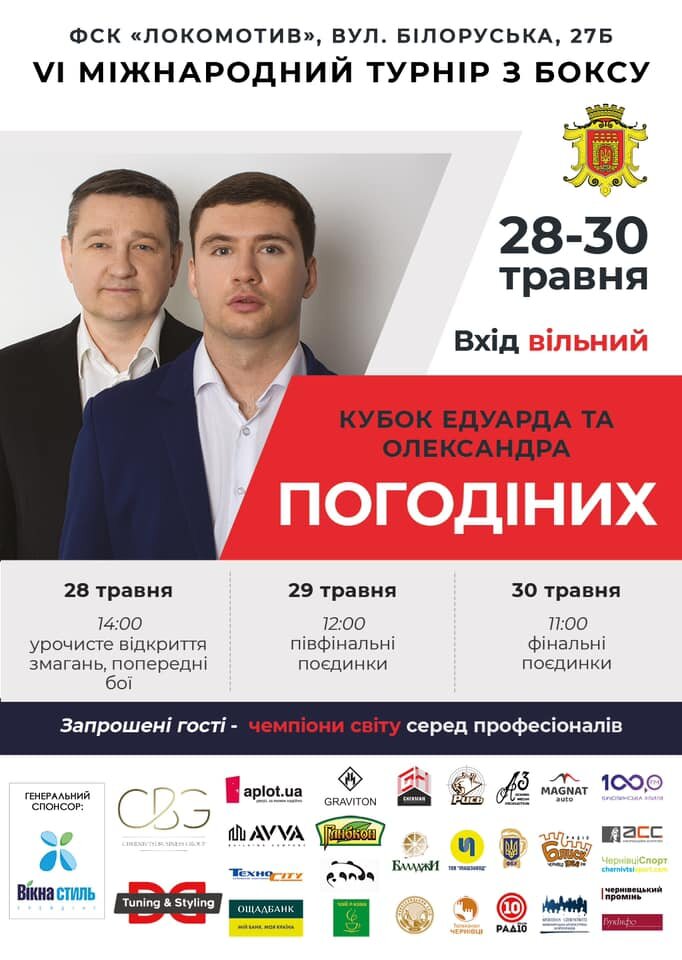 С 28 по 30 мая в Черновцах пройдёт 6-й международный турнир "Кубок Эдуарда и Александра Погодиных". Участие в соревнованиях примут лучшие боксёры Украины, а также команды из Молдовы, Латвии и Казахстана.