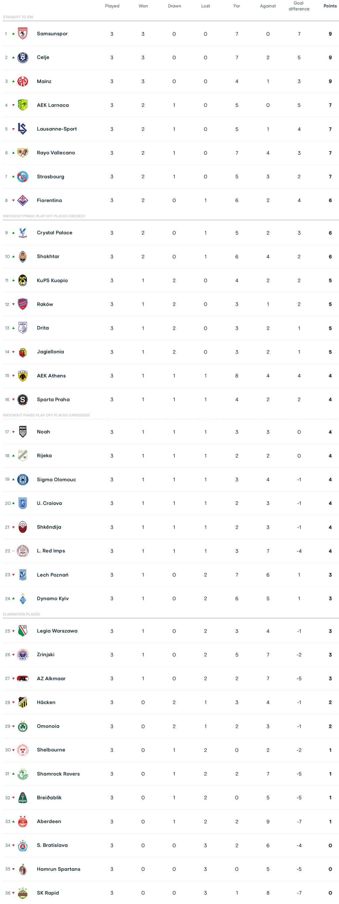 Нагадаємо регламент Ліги конференцій. Після закінчення основного етапу, перші вісім команд автоматично проходять до 1/8 фіналу. Команди, що фінішують з 9-го по 24-те місця зіграють в 1/16 фіналу. Команди, що посядуть 25—36 позиції закінчать євросезон.