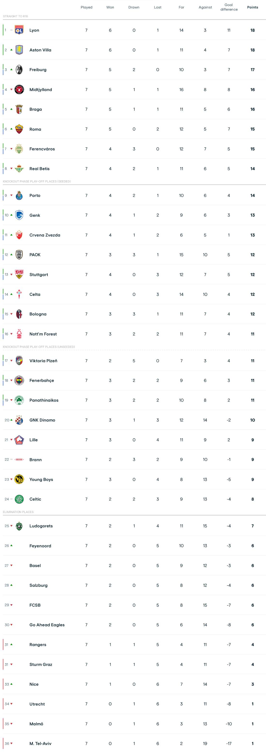 Наразі дві команди, Ліон та Астон Вілла, забезпечили собі місця в 1/8 фіналу турніру, а шість клубів, Меккабі (Т-А), Мальме, Утрехт, Ніца, Штурм і Глазго Рейнджерс, втратили, навіть, математичні шанси зачепитися за плей-оф.