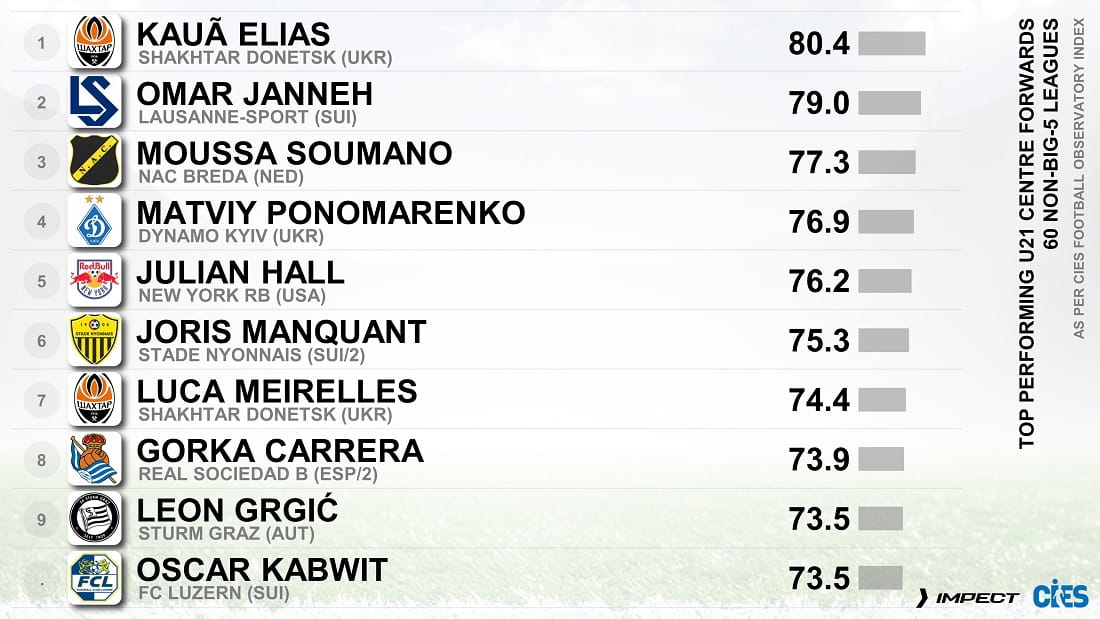 Міжнародний центр спортивних досліджень (CIES) опублікував рейтинг найкращих центральних форвардів, молодших за 21 рік, які не грають в топ-5 чемпіонатах Європи.