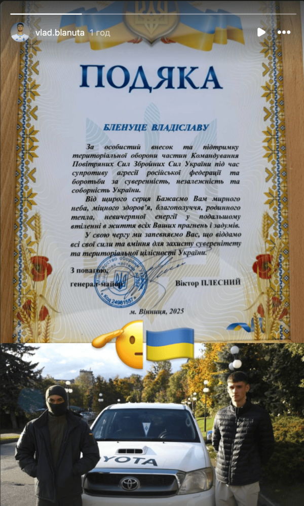 Минулого тижня на своїй сторінці в Instagram Бленуце заявив, що придбав автівку на потреби ЗСУ за 700 тисяч гривень. Вже в понеділок румунський форвард повідомив про те, що отримав подяку від українських військових.