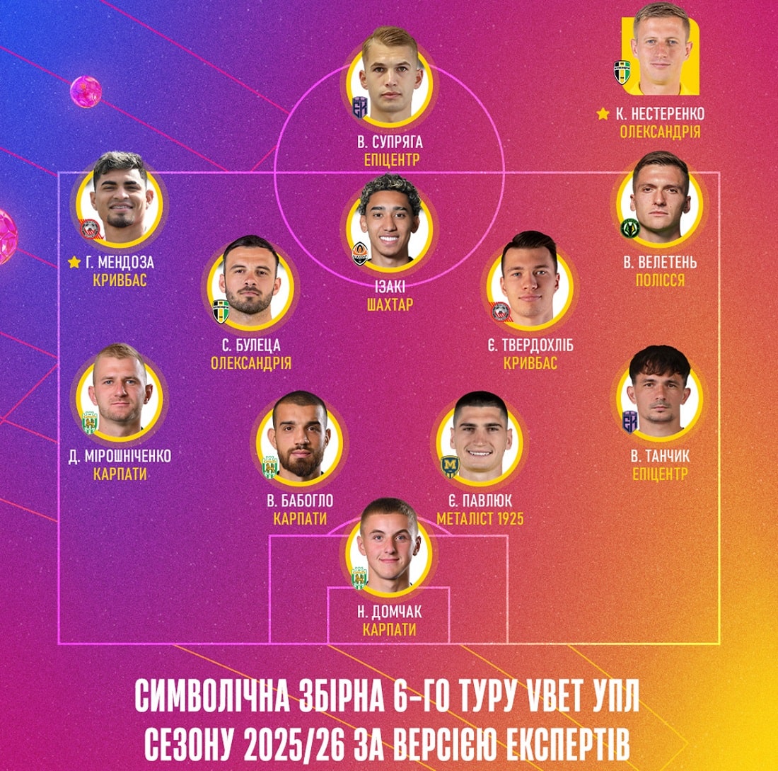 Збірна 6-туру: Домчак (Карпати) — Танчик (Епіцентр), Павлюк (Металіст 1925), Бабогло (Карпати), Мірошниченко (Карпати) — Твердохліб (Кривбас), Ізакі (Шахтар), Булеца (Олександрія) — Велетень (Полісся), Мендоза (Кривбас) — Супряга (Епіцентр).