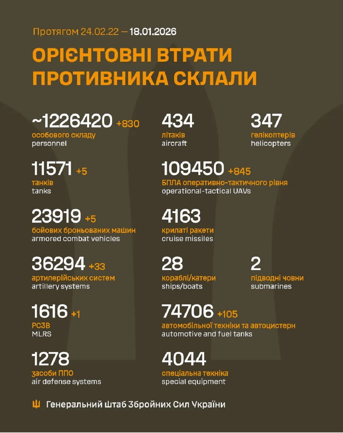 Вже мінус 1 226 420 : Генштаб ЗСУ назвав свіжі дані втрат загарбників за час їхнього вторгнення в Україну
