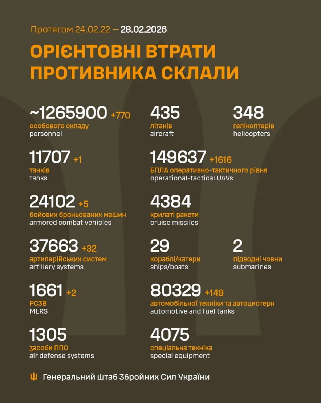 Генеральний штаб Збройних сил України оприлюднив свіжу інформацію про втрати московитських окупантів після початку їхнього повномасштабного вторгнення до нашої країни.
