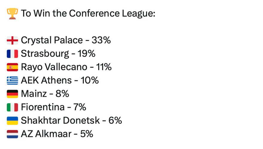 Головним фаворитом названо Крістал Пелас – ймовірність їхнього тріумфу оцінюється у 33%. Далі у списку претендентів ідуть Страсбур (19%), Райо Вальєкано (11%) та АЕК (10%).