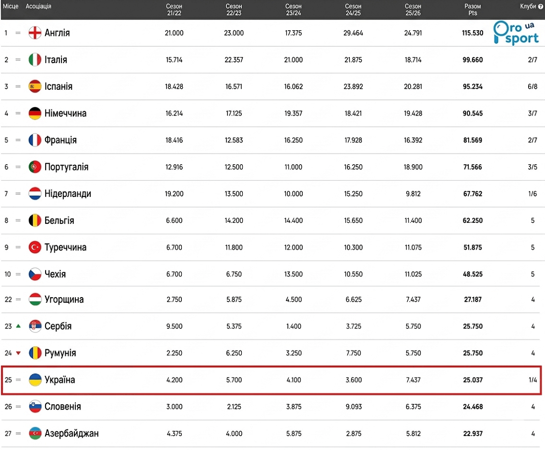 Посідаючи 25-те місце, Україна фактично не має суперників, які можуть її обігнати серед 30 країн, що перебувають на нижчих позиціях. Поточна позиція в рейтингу передбачає чотири квоти в єврокубках: одну — у Лізі чемпіонів (перший кваліфікаційний раунд), одну — у Лізі Європи (перший кваліфікаційний раунд) та дві — у Лізі конференцій (другий кваліфікаційний раунд). Ця таблиця формує представництво країн на єврокубковий сезон-2027/2028.