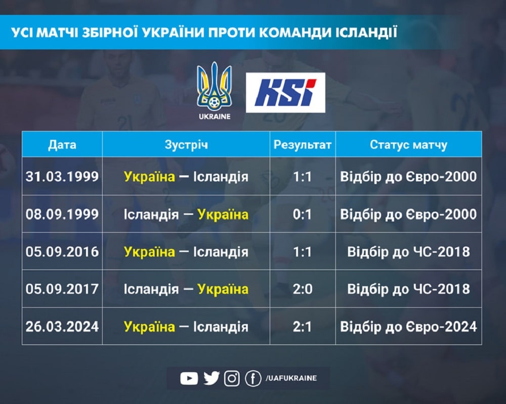 Сьогоднішній матч відбору ЧС-2026 Ісландія — Україна, який відбудеться в Рейк’явіку на стадіоні Лейгардальсведлюр (початок гри — о 21:45 за Києвом), стане п’ятою зустріччю суперників в історії.