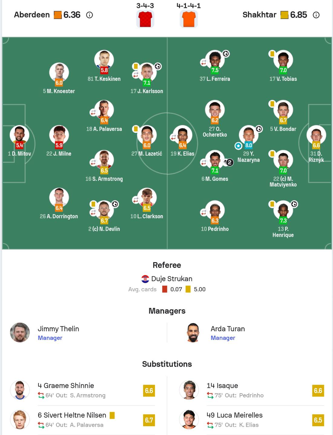 Авторитетний статистичний портал Sofascore оцінив дії футболістів Шахтаря та Абердіна у вчорашньому матчі першого туру основного етапу Ліги конференцій, який наша команда виграла з рахунком 3:2.