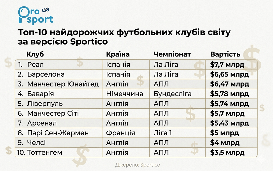 Sportico склав рейтинг найдорожчих футбольних клубів світу, який очолив мадридський Реал.