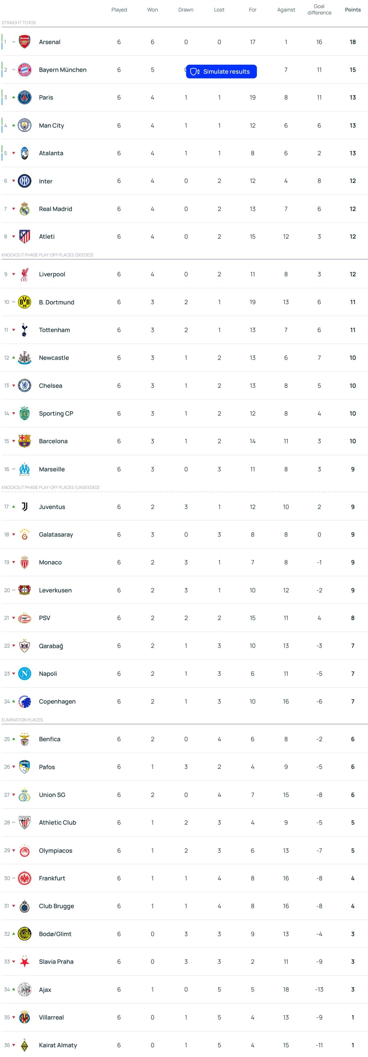Нагадаємо регламент ЛЧ. Після закінчення основного етапу, перші вісім команд автоматично проходять до 1/8 фіналу. Команди, що фінішують з 9-го по 24-те місця зіграють в 1/16 фіналу. Команди, що посядуть 25—36 позиції закінчать євросезон.