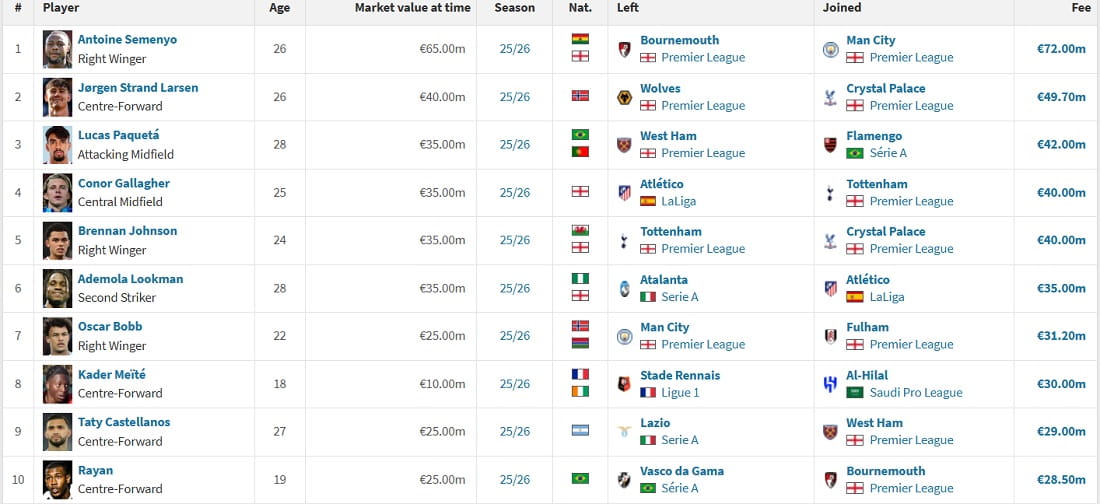 Давайте трохи підіб’ємо гроші. Отже, найдорожчою угодою січня-2026 став переїзд атакувального півзахисника з Гани Антуана Семеньо з Борнмуту до Манчестер Сіті. Містяни виклали за реактивного 26-річного хлопака 72 мільйони євро.
