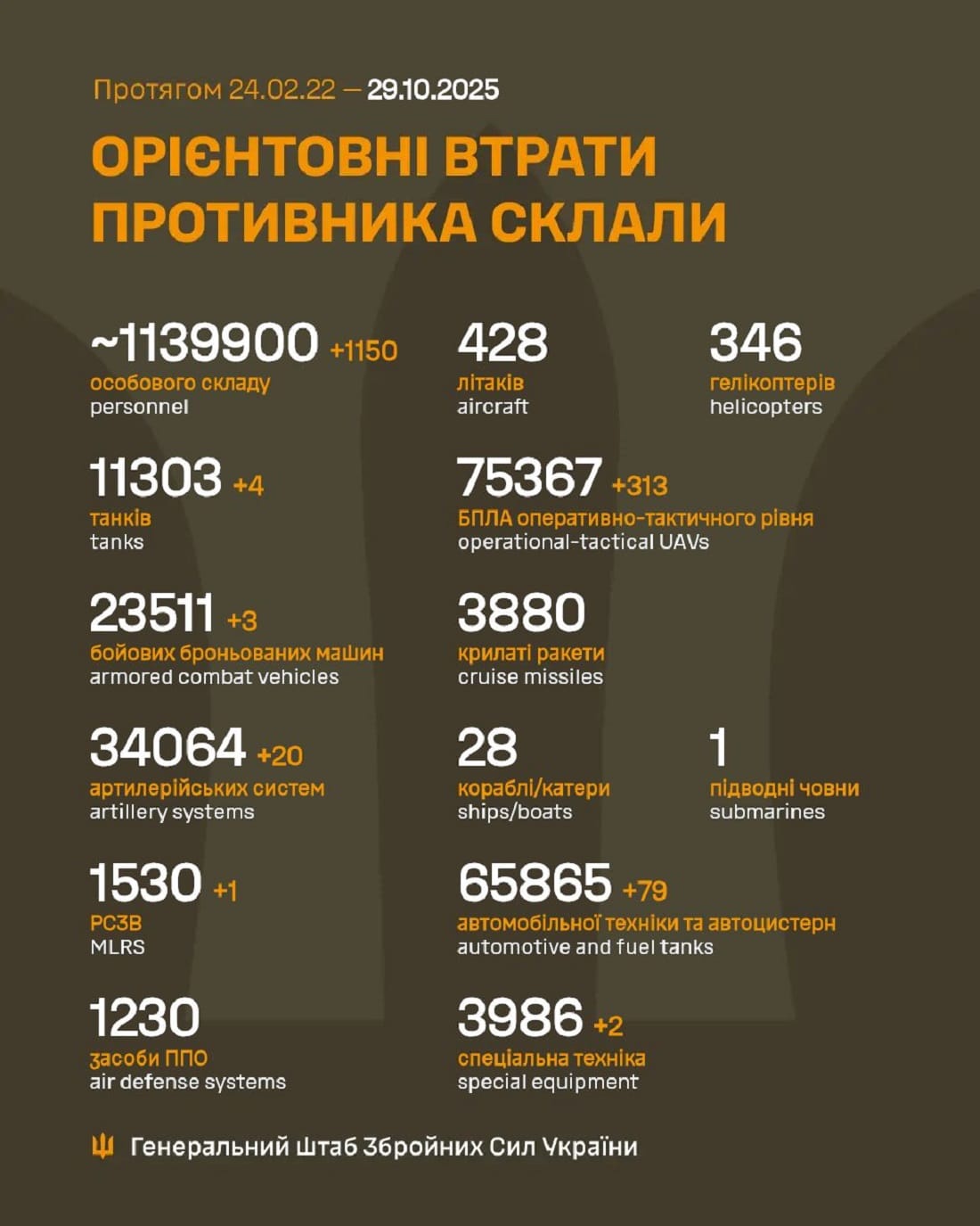 Вже мінус 1 139 900: Генштаб ЗСУ назвав свіжі дані втрат загарбників за час їхнього вторгнення в Україну