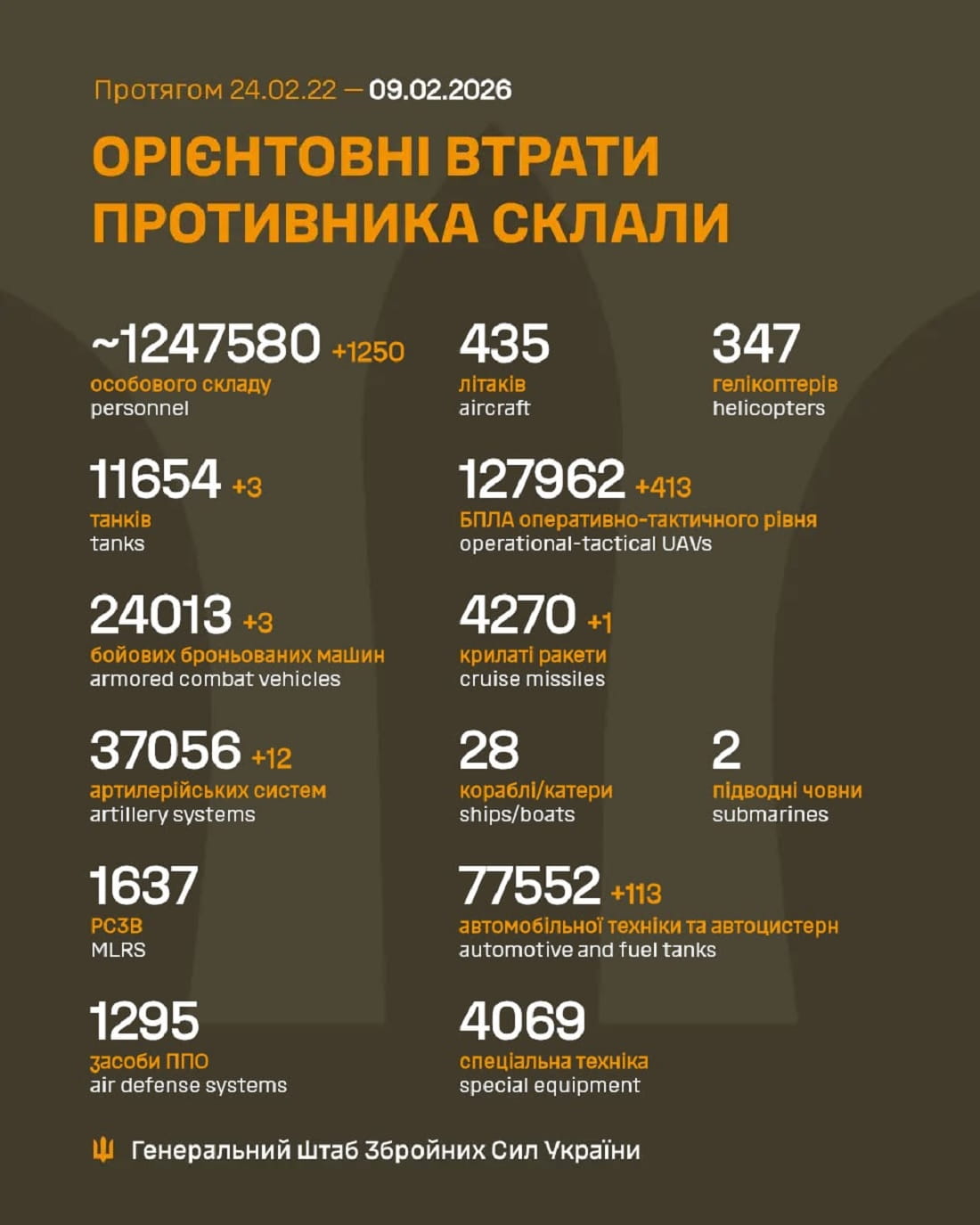 Вже мінус 1 247 580 : Генштаб ЗСУ назвав свіжі дані втрат загарбників за час їхнього вторгнення в Україну
