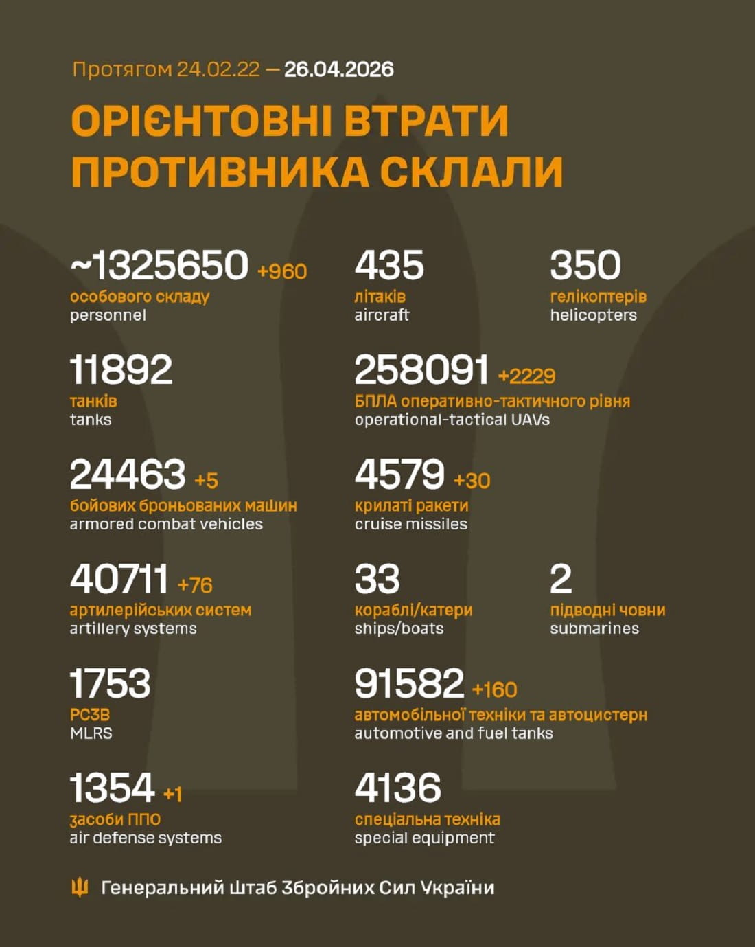 Вже мінус 1 325 650: Генштаб ЗСУ назвав свіжі дані втрат загарбників за час їхнього вторгнення в Україну